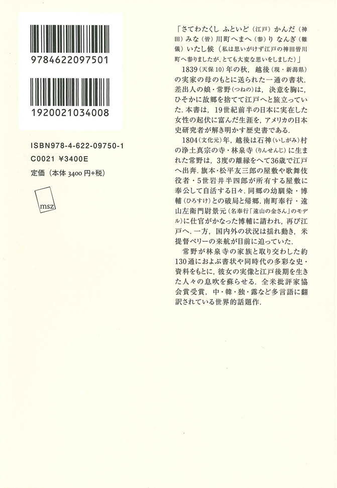 1839(天保10)年の秋、越後(現・新潟県)の実家の母のもとに送られた一通の書状。差出人の娘・常野(つねの)は、決意を胸に、ひそかに故郷を捨てて江戸へと旅立っていた。本書は、19世紀前半の日本に実在した女性の起伏に富んだ生涯を、アメリカの日本史研究者が解き明かす歴史書である。
