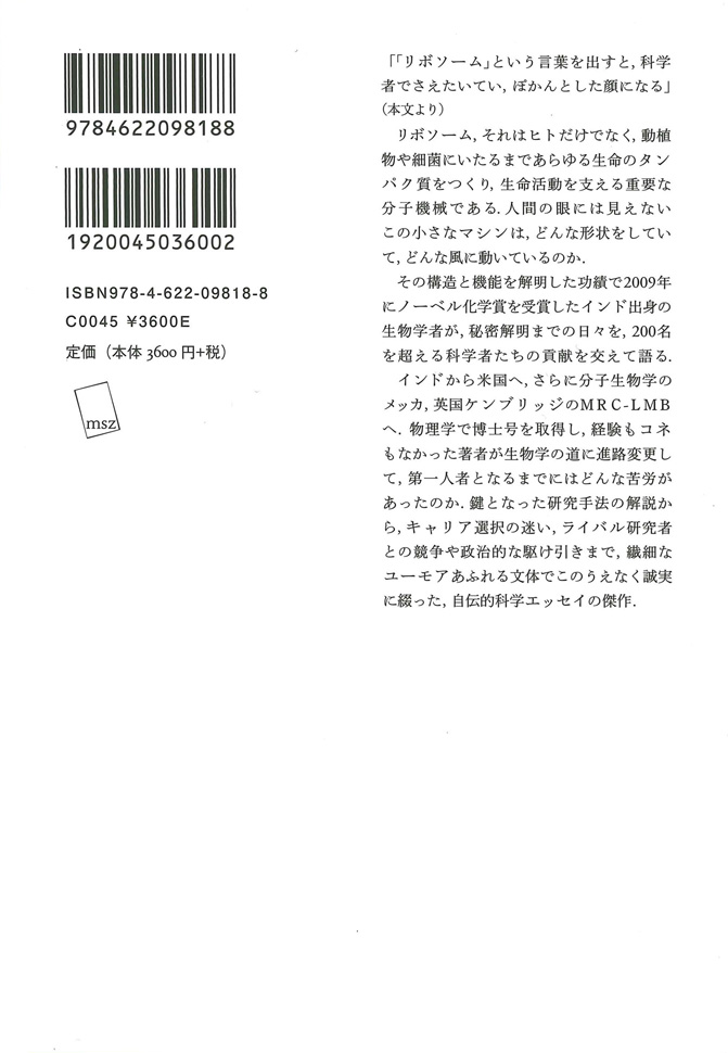その構造と機能を解明した功績で2009年にノーベル化学賞を受賞したインド出身の生物学者が、秘密解明までの日々を、200名を超える科学者たちの貢献を交えて語る。