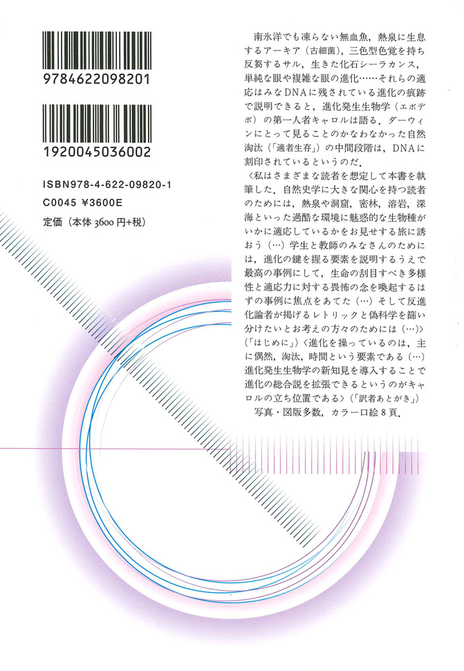 南氷洋でも凍らない無血魚、熱泉に生息するアーキア(古細菌)、三色型色覚を持ち反芻するサル、生きた化石シーラカンス、単純な眼から複雑な眼までさまざまな眼の進化……それらの適応はみなDNAに残されている進化の痕跡で説明できると、進化発生生物学(エボデボ)の第一人者キャロルは語る。ダーウィンにとって見ることのかなわなかった自然淘汰(「適者生存」)の中間段階は、DNAに刻印されているというのだ。