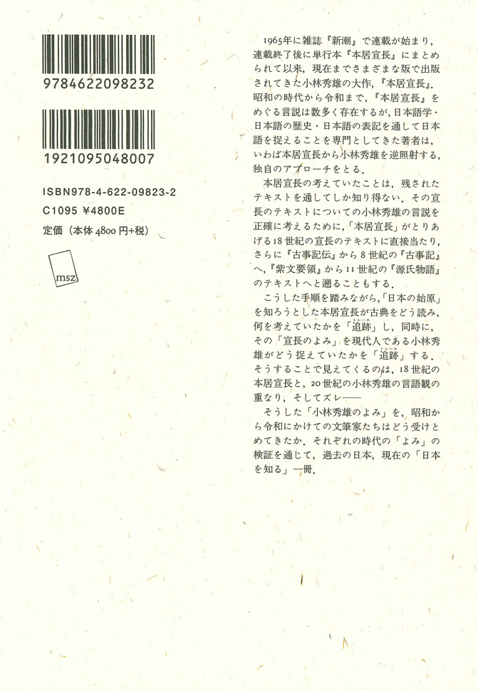 1965年に雑誌『新潮』で連載が始まり、連載終了後に単行本『本居宣長』にまとめられて以来、現在までさまざまな版で出版されてきた小林秀雄の大作、『本居宣長』。昭和の時代から令和まで、『本居宣長』をめぐる言説は数多く存在するが、日本語学・日本語の歴史・日本語の表記を通して日本語を捉えることを専門としてきた著者は、いわば本居宣長から小林秀雄を逆照射する、独自のアプローチをとる。