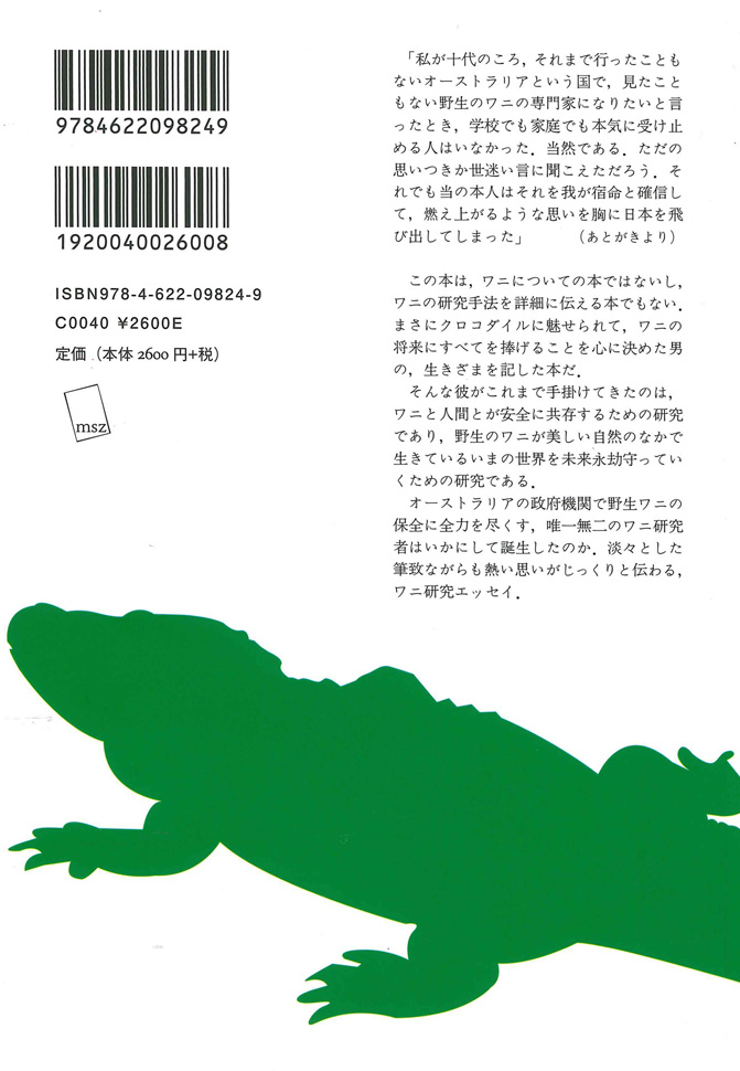オーストラリアの政府機関で野生ワニの保全に全力を尽くす、唯一無二のワニ研究者はいかにして誕生したのか。淡々とした筆致ながらも熱い思いがじっくりと伝わる、ワニ研究エッセイ。