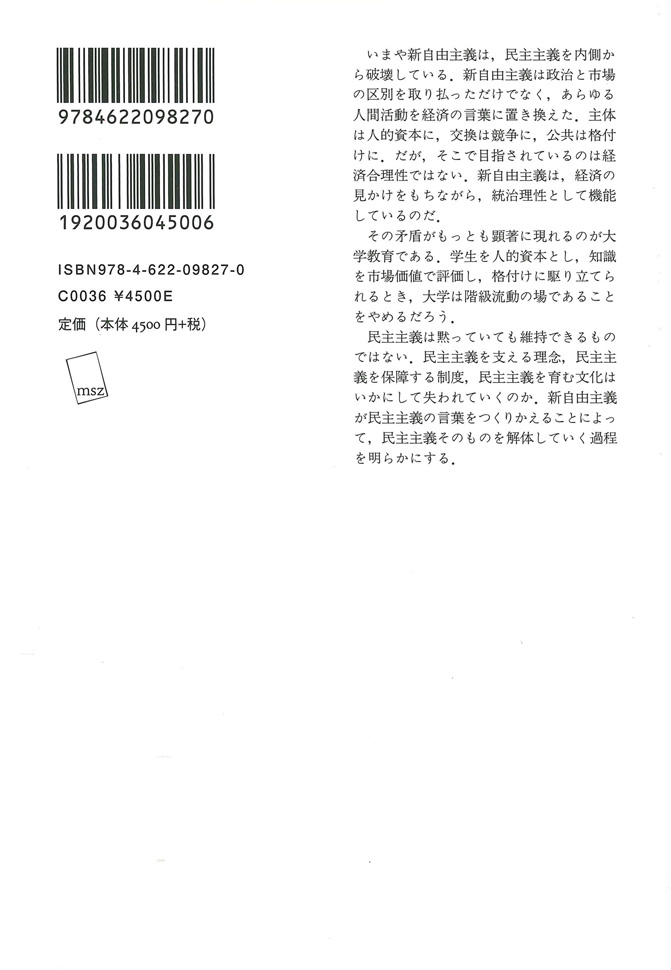 民主主義は黙っていても維持できるものではない。民主主義を支える理念、民主主義を保障する制度、民主主義を育む文化はいかにして失われていくのか。新自由主義が民主主義の言葉をつくりかえることによって、民主主義そのものを解体していく過程を明らかにする。