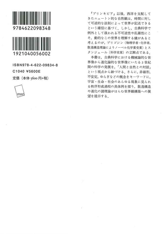 『プリンキピア』以後、西洋を支配してきたニュートン的な自然観は、時間に対して可逆的な法則によって世界が記述できるという確信に基づく。しかし、古典科学で例外として扱われる不可逆性や乱雑性にこそ、動的なこの世界を理解する鍵があると考えるのが、プリゴジン(物理学者・化学者、散逸構造理論によりノーベル化学賞受賞)とスタンジェール(科学史家)の立脚点である。