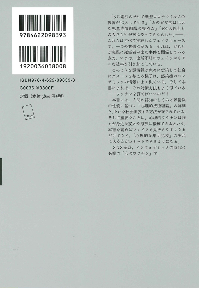 本書には、人間の認知のしくみと誤情報の性質に基づく「心理的接種理論」の詳細と、それを社会実装する方法が記されている。そして重要なことに、心理的ワクチンは誰もが身近な友人や家族に接種できるという。本書を読めばフェイクを見抜きやすくなるだけでなく、「心理的な集団免疫」の実現にあなたがコミットできるようになる。