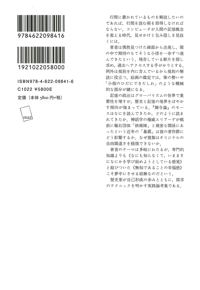 記憶の政治はグローバリズムの世界で重要性を増すが、歴史と記憶の境界をぼやかす傾向が強まっている。『贈与論』のモースはなにを読んできたか、どのように読まれてきたか。神話学の権威エリアーデが戦前に極右団体「鉄衛隊」と親密な関係にあったという近年の「暴露」は彼の著作群にどう影響するか。なぜ複製はオリジナルの自由闊達さを模倣できないか。