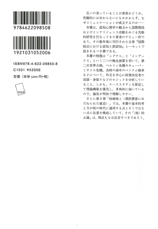 本書の特徴は「シグナル」と「インデックス」という二つの概念装置を用いて、第二次世界大戦、ベルリン危機やキューバ・ミサイル危機、当時の渦中のベトナム戦争などについて、外交を中心に政策決定者の言語・身振りなどのロジックを分析していること、しかも、ケーススタディを限定して理論構築を優先し、多角的に描いているので、論旨が明快で理解しやすい。