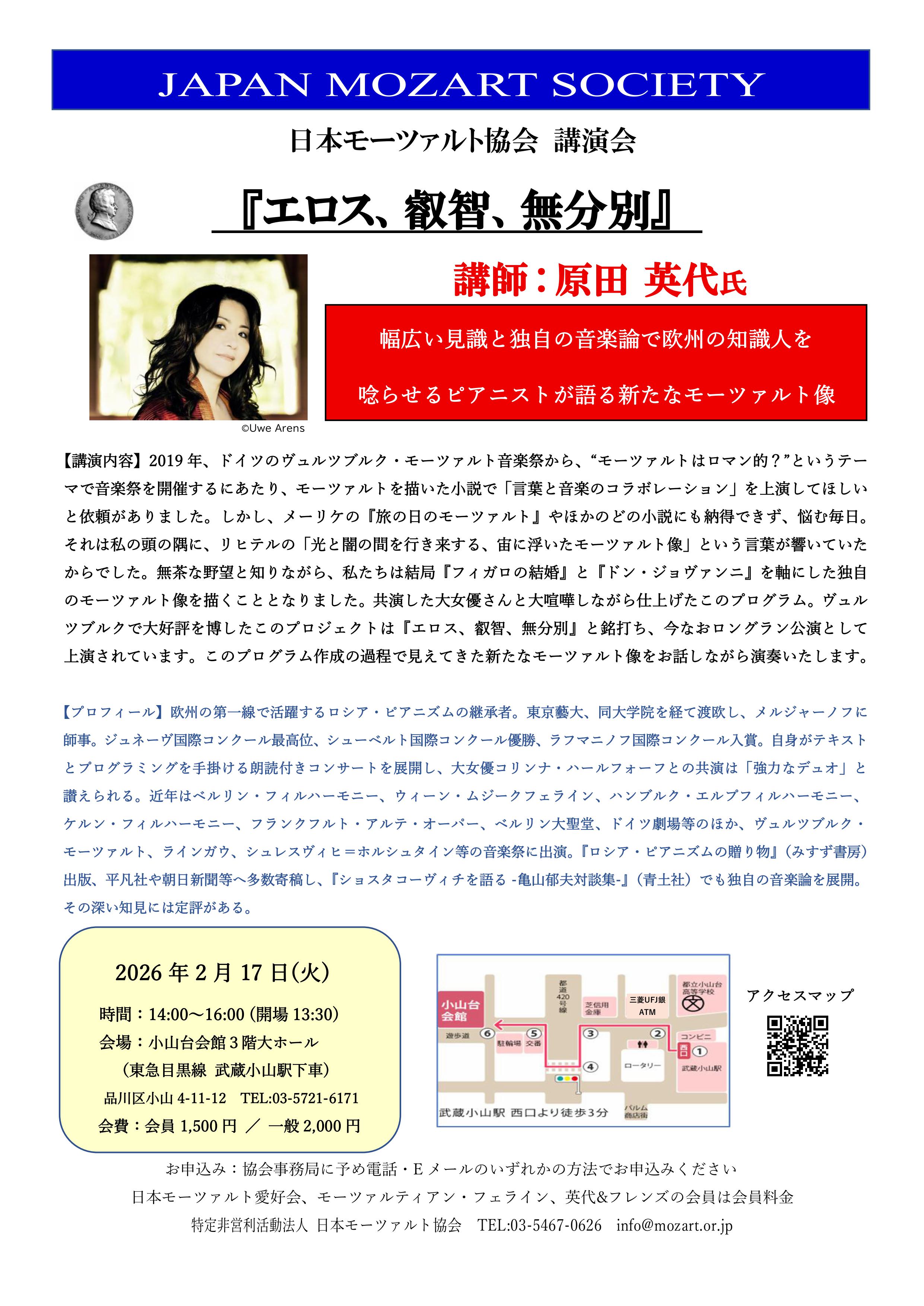 日本モーツァルト協会講演会 原田英代「エロス、叡智、無分別」が、2026年2月17日(火)14:00-16:00、小山台会館 3階 大ホールで開かれます(東京・武蔵小山、東急目黒線「武蔵小山駅」西口より徒歩3分)。