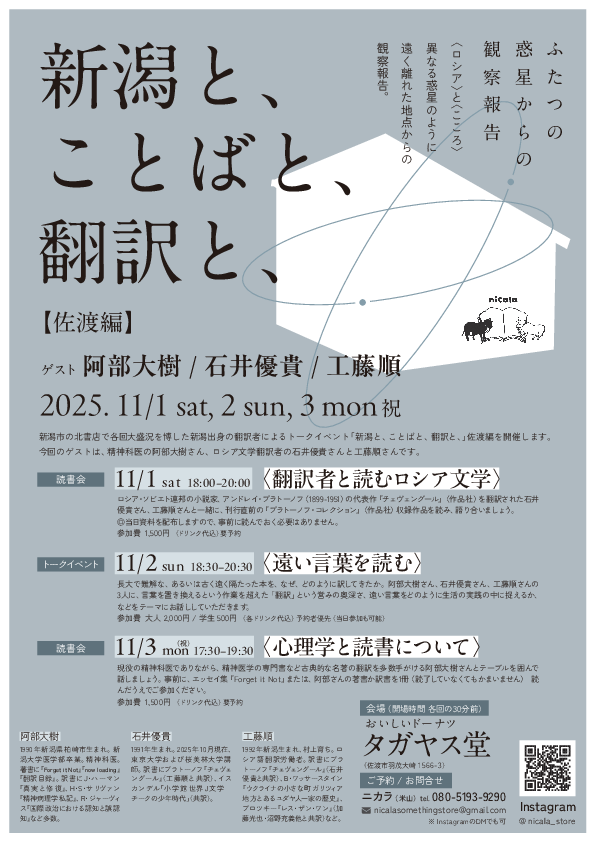新潟出身の翻訳者によるトークイベントです。ゲスト阿部大樹(精神科医)、石井優貴(ロシア文学翻訳者)、工藤順(ロシア文学翻訳者)。